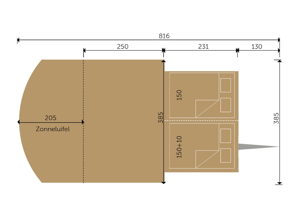 AfmetingenWoongedeelte van 250 x 385 cm, optioneel te voorzien van een luifel (200 x 385cm)