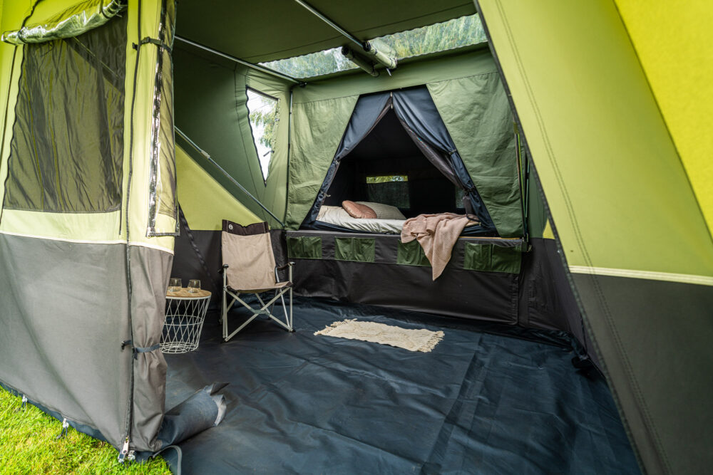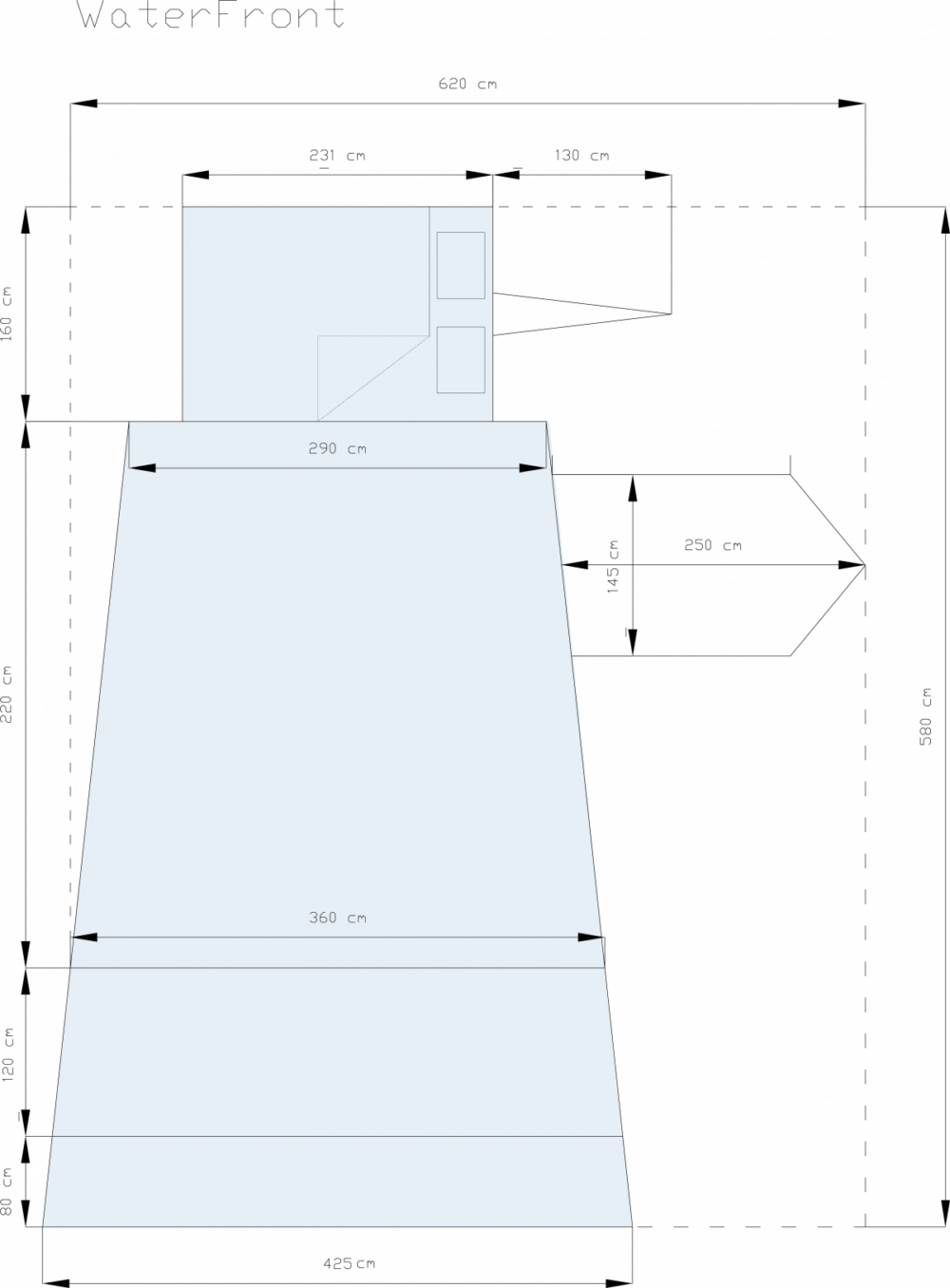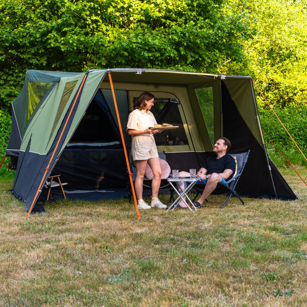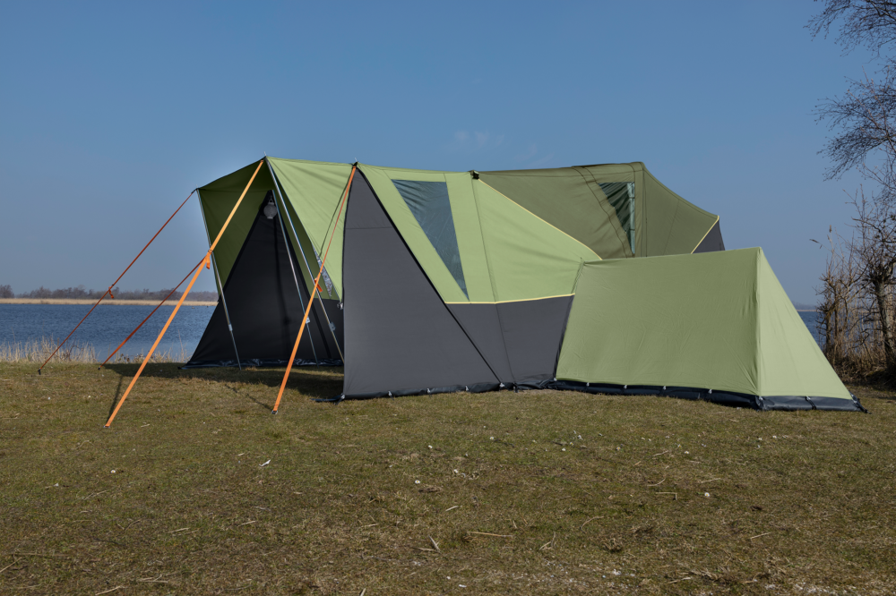AfmetingenWoongedeelte van 220 x 290/361 cm, standaard voorzien van een luifel (120 cm) en uit te breiden met extra luifel (80 cm)